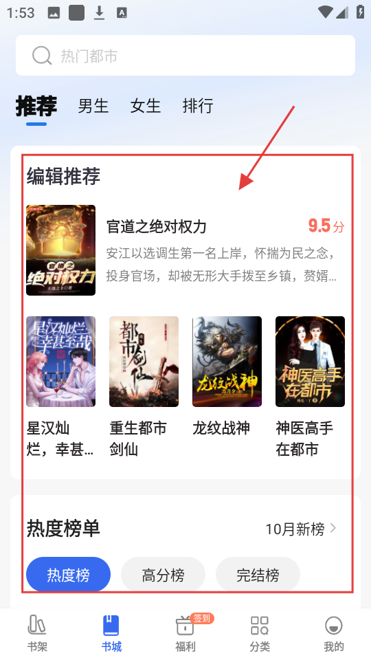 1、书城【编辑推荐】里有高分小说,像【官道之绝对权力】9.5分,快看看有没有你喜欢的吧。