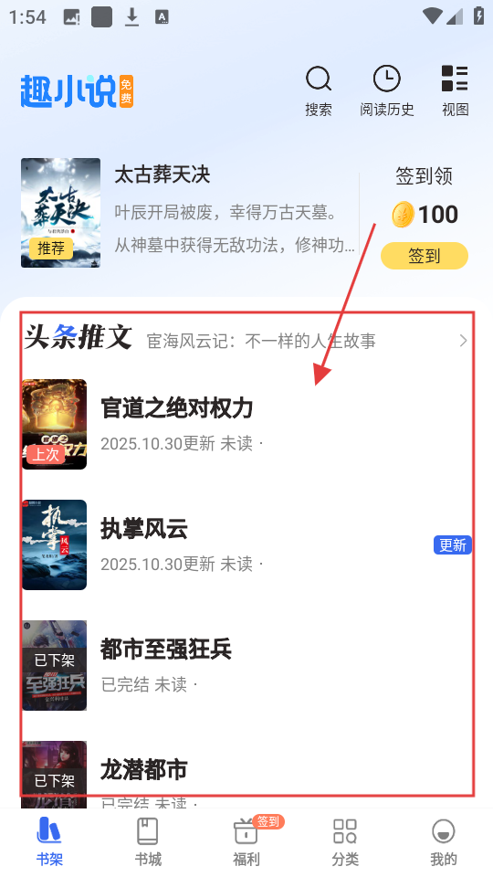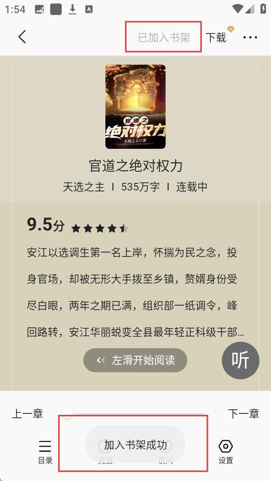 4、书架里能看到添加的【官道之绝对权力】,还有其他小说,想看随时点进去读哦。