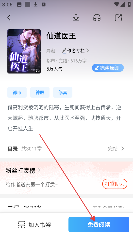 2、在小说详情页,点击【免费阅读】按钮,进入小说阅读页面哦。