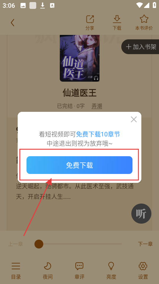 4、在提示框中点击【免费下载】按钮,即可下载小说章节,方便离线阅读啦。