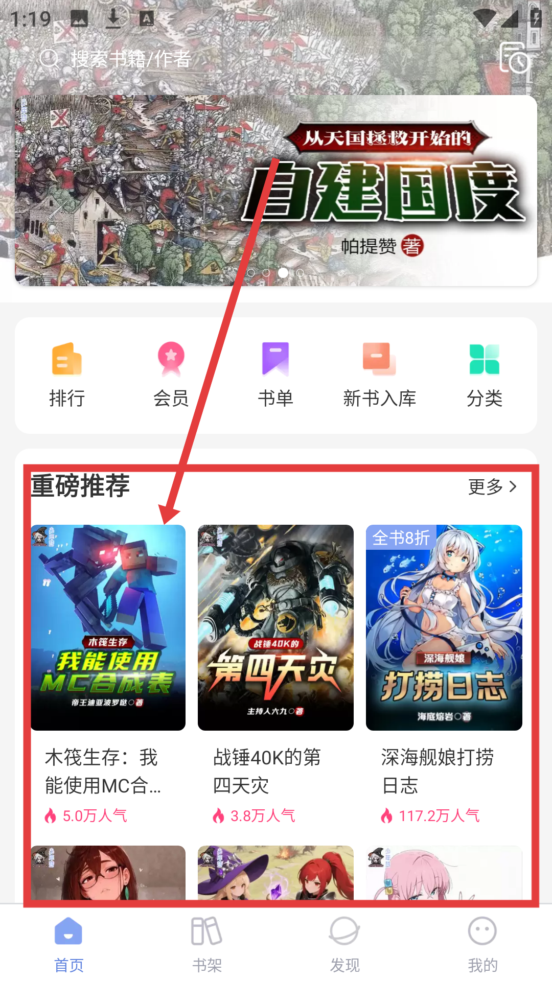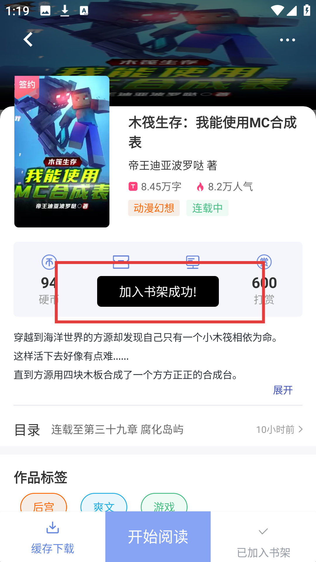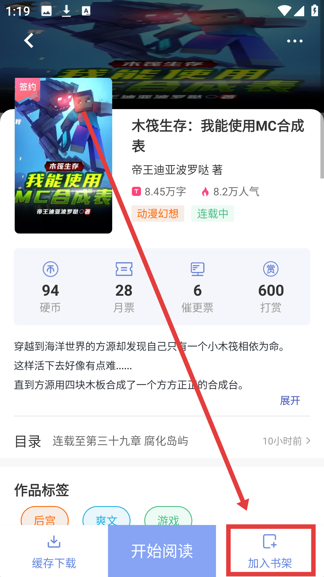 1、在首页重磅推荐里选喜欢的小说,像【木筏生存:我能使用MC合成表】,点击进入小说详情界面哦。