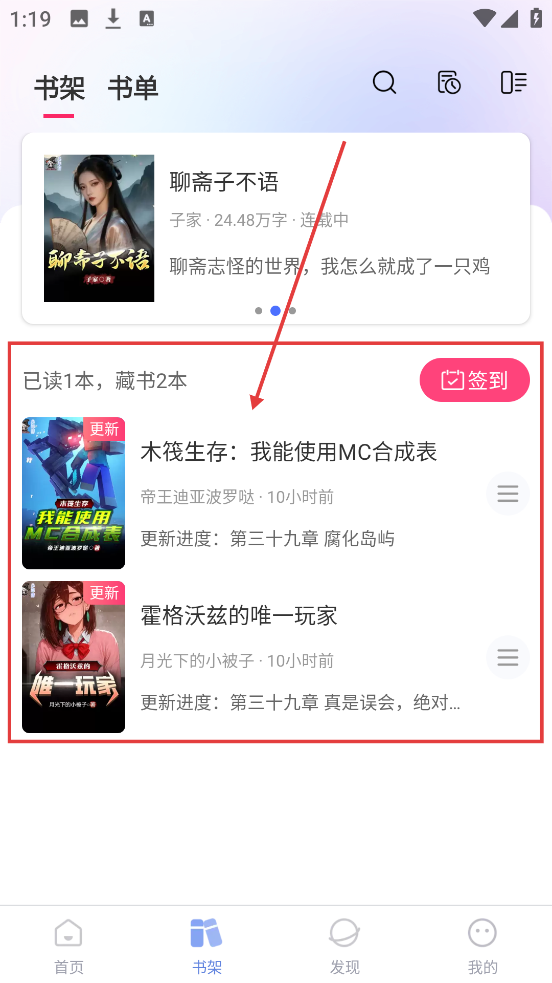 4、点击【书架】,进入书架界面,可查看已加入的小说,随时继续阅读啦。