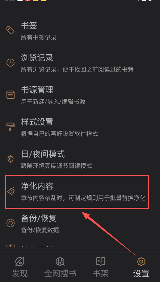 2、遇到章节内容杂乱、格式混乱的情况,可使用“净化内容”功能设置过滤规则,自动清理多余内容和格式错误。