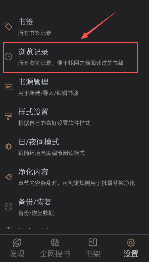 3、忘记阅读进度或重要情节时,可以在“浏览记录”中查找阅读历史,或在“书签”中找回标记的关键位置。