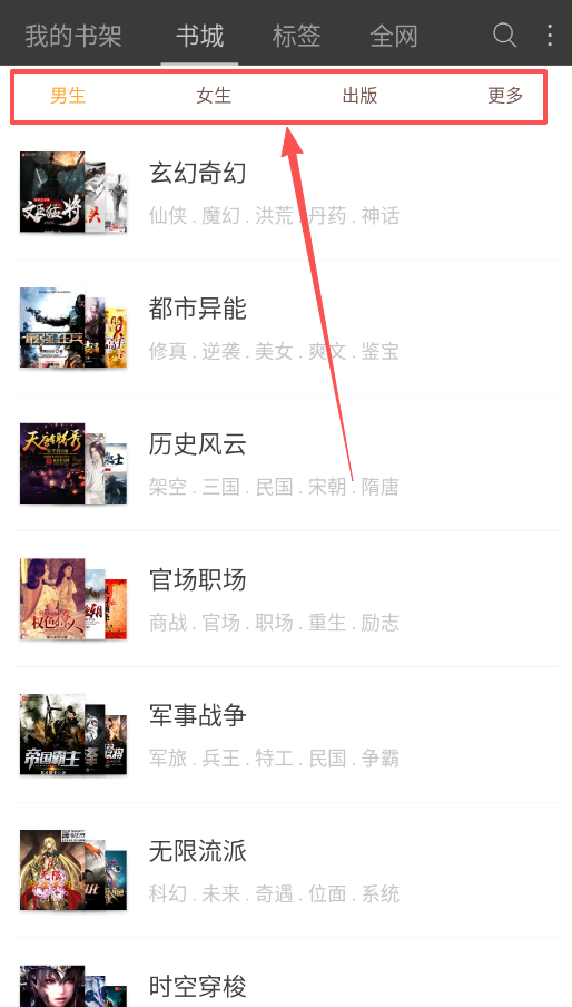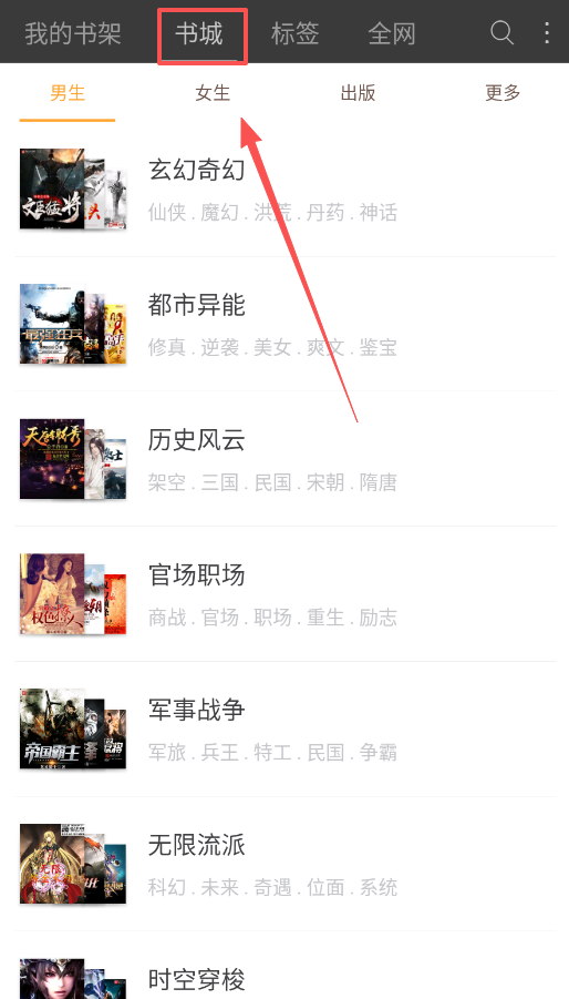 2、在书城页面上方选择“男生”或“女生”,进入后能看到玄幻、都市等大分类,每个分类下还有具体的风格标签。