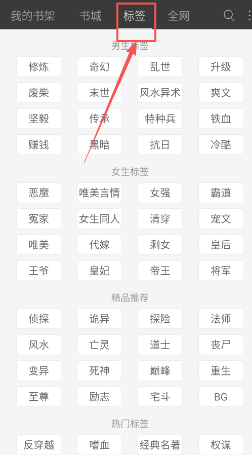 3、切换到“标签”页面,这里用关键词云的方式展示了所有标签,从“修炼”、“末世”到“霸道”、“清穿”,覆盖各种口味。