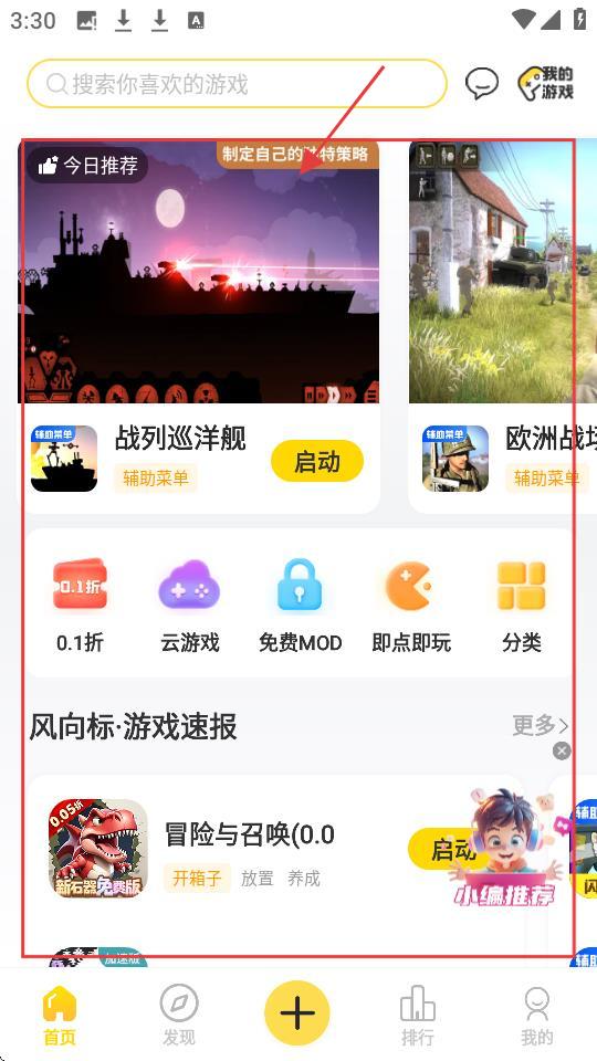 1、我们进入软件,看到推荐的《战列巡洋舰》等游戏,若对某款游戏感兴趣,点击游戏区域,即可进入游戏详情页啦。