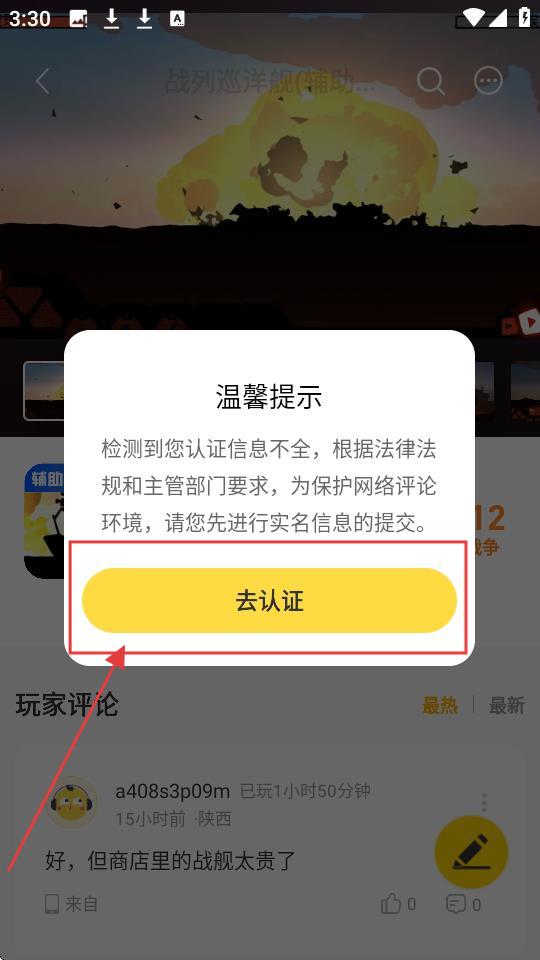 4、若认证信息不全,会弹出提示框,点击【去认证】,进行实名信息提交,完成后就能发表评论啦。