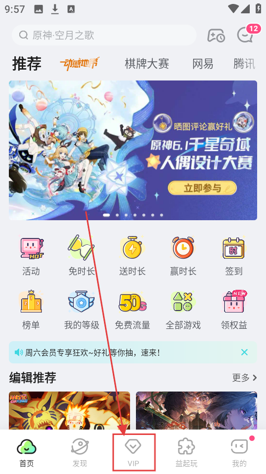 1、在首页点击【VIP】,就能进入会员中心,查看会员专属权益哦。