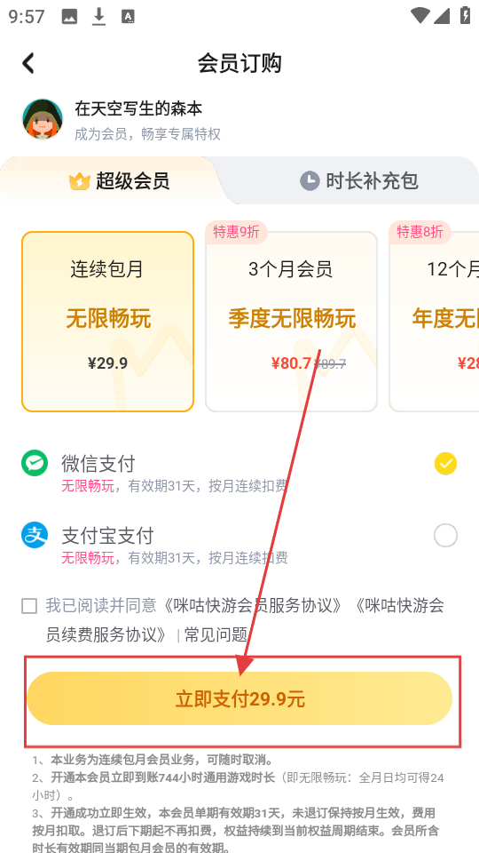 3、在会员订购页面选择套餐后,点击【立即支付29.9元】,就能进行支付操作哦。