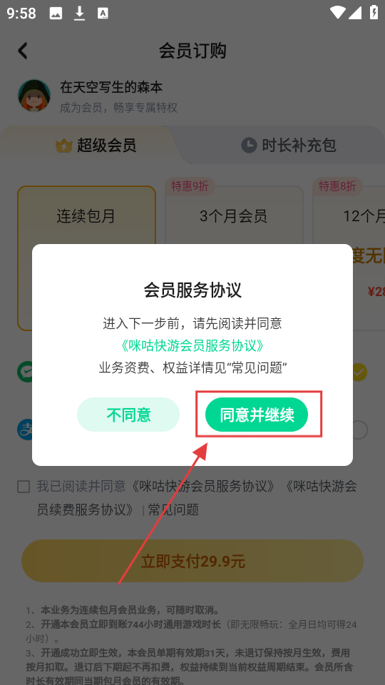 4、支付前点击【同意并继续】,确认会员服务协议,就能完成会员开通流程啦。