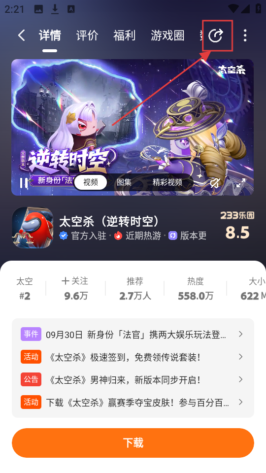 1、看到推荐里【太空杀-逆转时空】的宣传啦,新身份「法官」上线超吸引人,点进去瞧瞧详细内容呗。