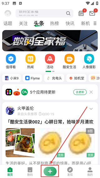 1、在首页点击底部的【+】按钮,就能进入内容发布界面,准备分享自己的动态啦。
