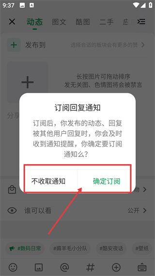 2、进入发布界面后,会弹出【订阅回复通知】的确认框,选择【确定订阅】就能开启回复通知提醒哦。