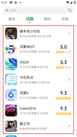 4、进入话题页面,可看到各类热门话题,选择合适的话题关联动态,能让更多人看到你的分享哦。