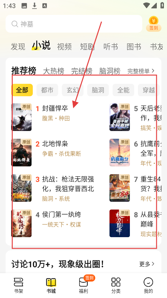 1、我们在软件首页,能看到搜索框和各类内容分类,点击推荐榜里的《封疆悍卒》,就能进入该小说阅读页面啦。