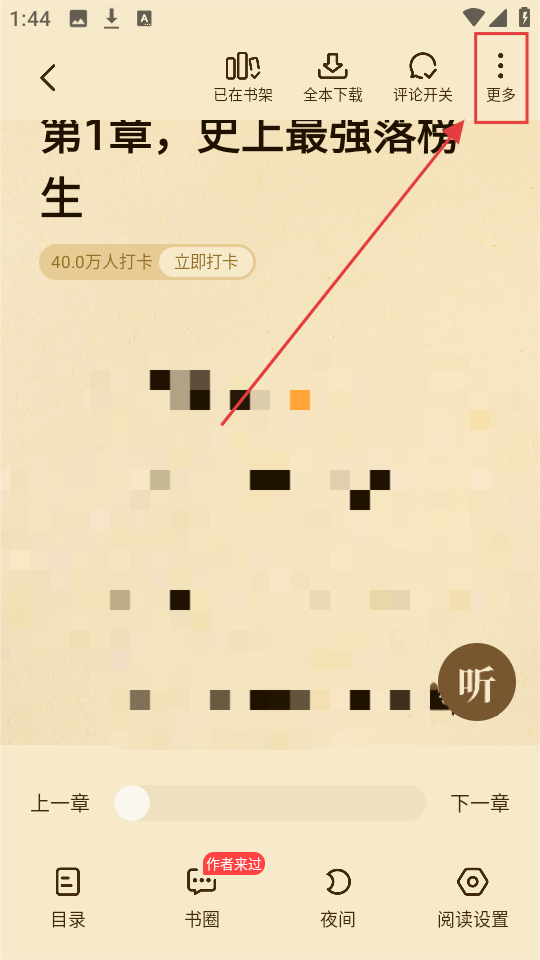 2、进入小说阅读页面后,我们可以点击右上角的【更多】,展开更多操作选项。
