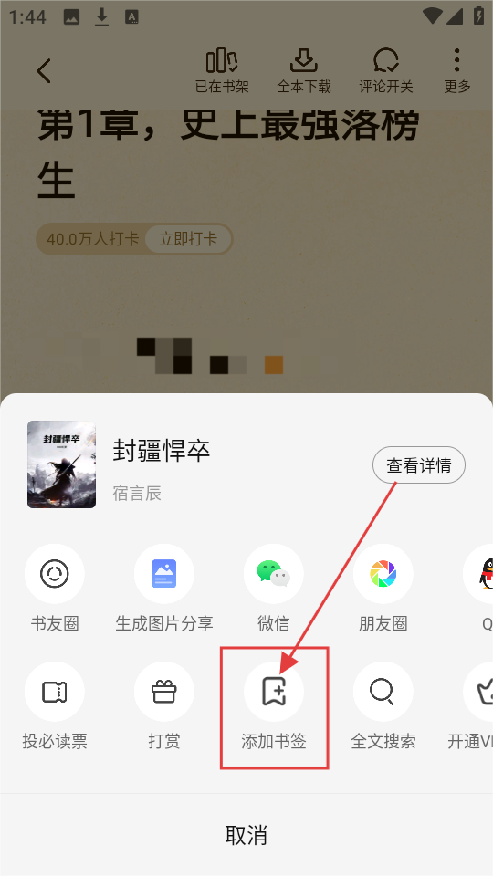 3、展开更多选项后,点击【添加书签】,将当前阅读的章节添加为书签,方便后续快速找到该章节。
