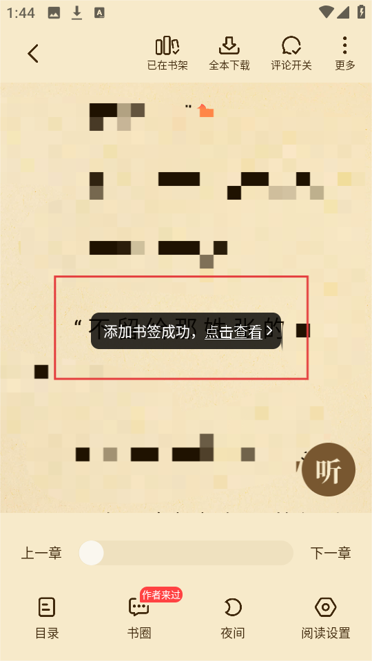 4、点击添加书签后,会弹出“添加书签成功”的提示,说明我们已经成功将该章节添加为书签啦。