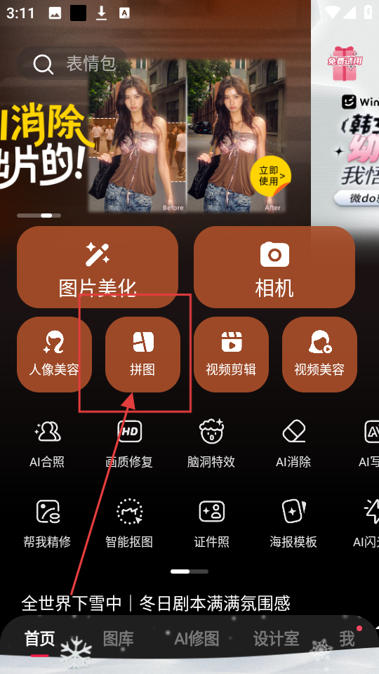 1、在首页找到【拼图】功能按钮并点击,即可进入拼图编辑页面啦。