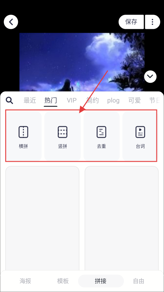 2、进入拼图页面,可选择横拼、竖拼、去重、台词等不同拼图样式哦。