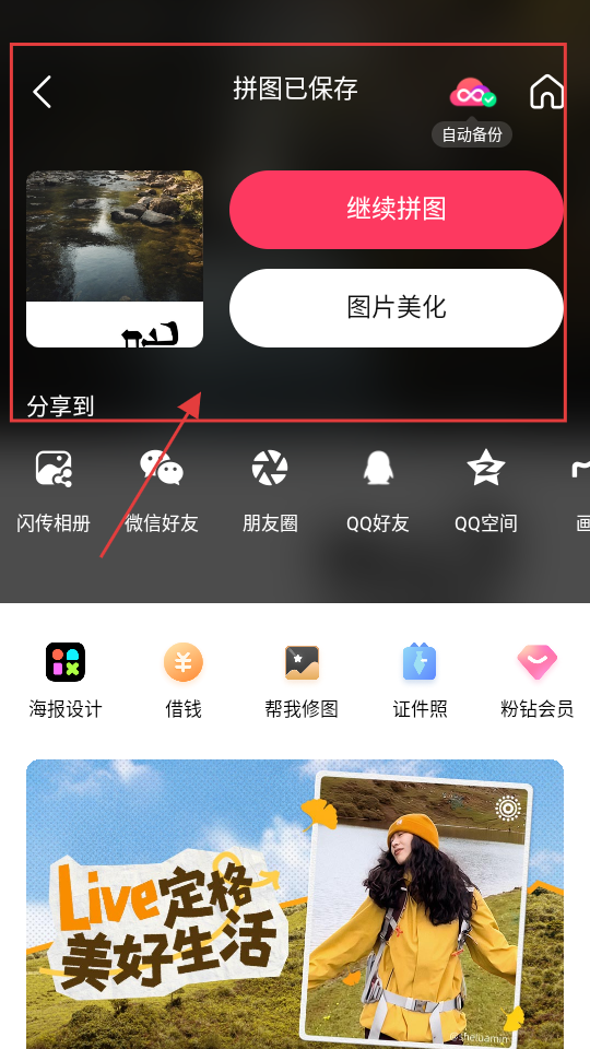 4、拼图保存后,可选择继续拼图、图片美化或分享到社交平台,很方便哦。