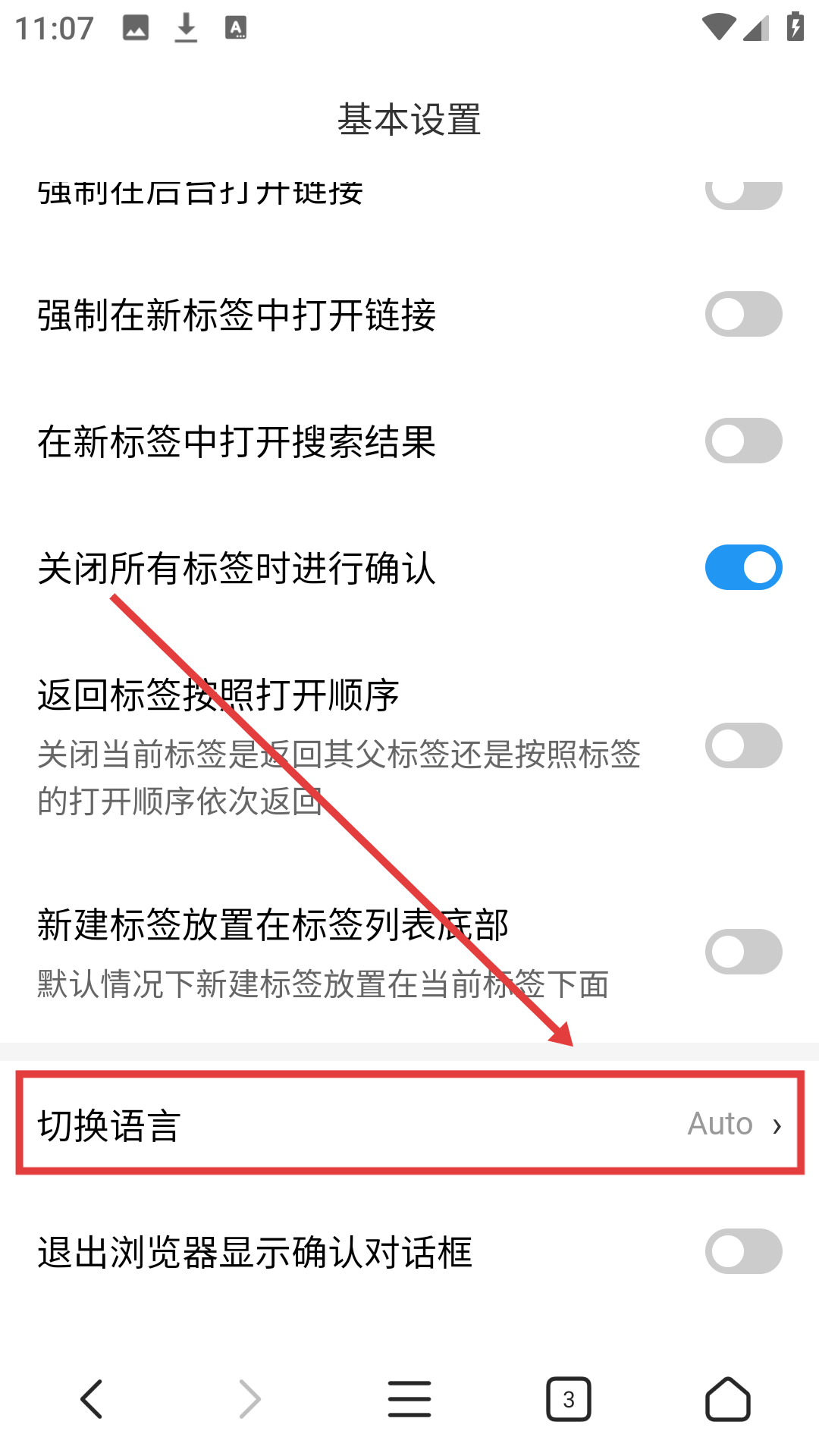 3、在基本设置界面点击【切换语言】,进入语言选择界面,开始调整语言设置哦。