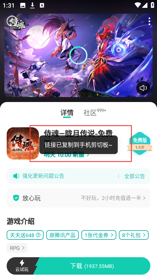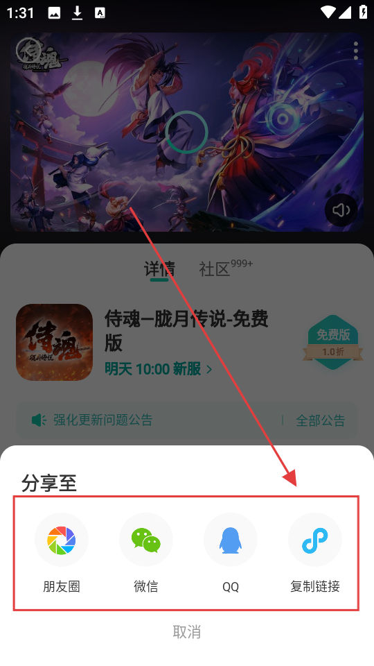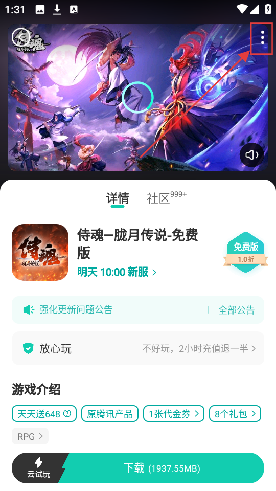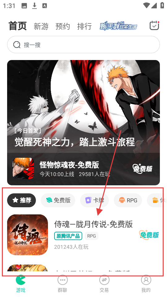 1、在首页,点击【侍魂-胧月传说-免费版】,可进入游戏详情页,了解游戏信息啦。