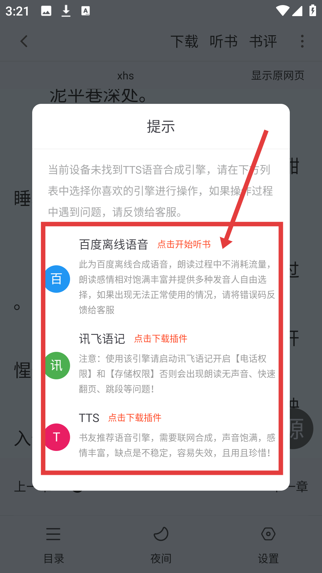 2、选择喜欢的语音引擎,如【百度离线语音】,按提示操作,开启听书体验啦。