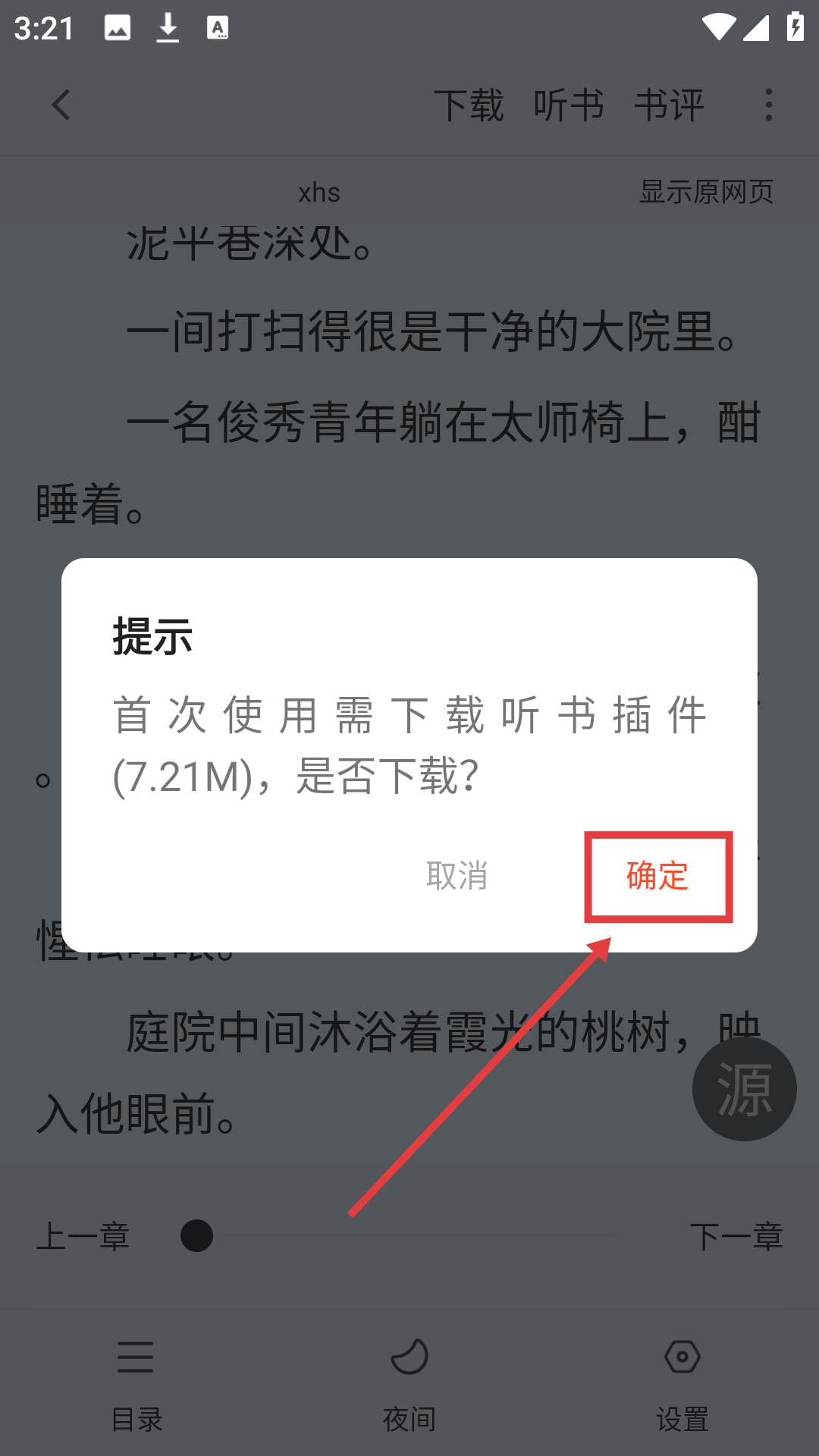 3、首次使用听书功能,点击【确定】下载听书插件,完成后即可听书哦。