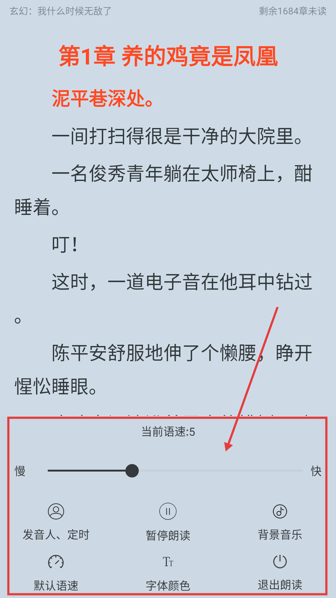 4、听书时可调整语速、发音人等设置,如设置语速为5,还能暂停朗读、换背景音乐,打造专属听书体验啦。