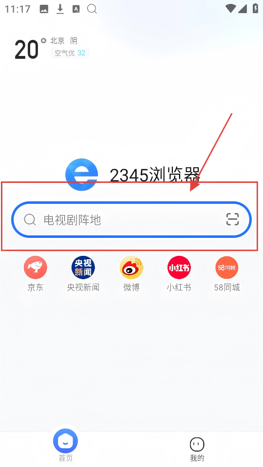 1、在2345浏览器首页,搜索框可输入内容,像【电视剧阵地】,输入后能查找相关内容,超方便的。