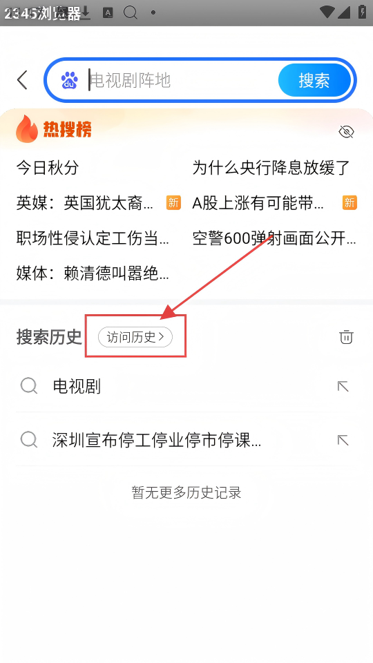 2、搜索后,在搜索页面能看到搜索历史和【访问历史】按钮,点击【访问历史】,可查看过往访问记录哟。