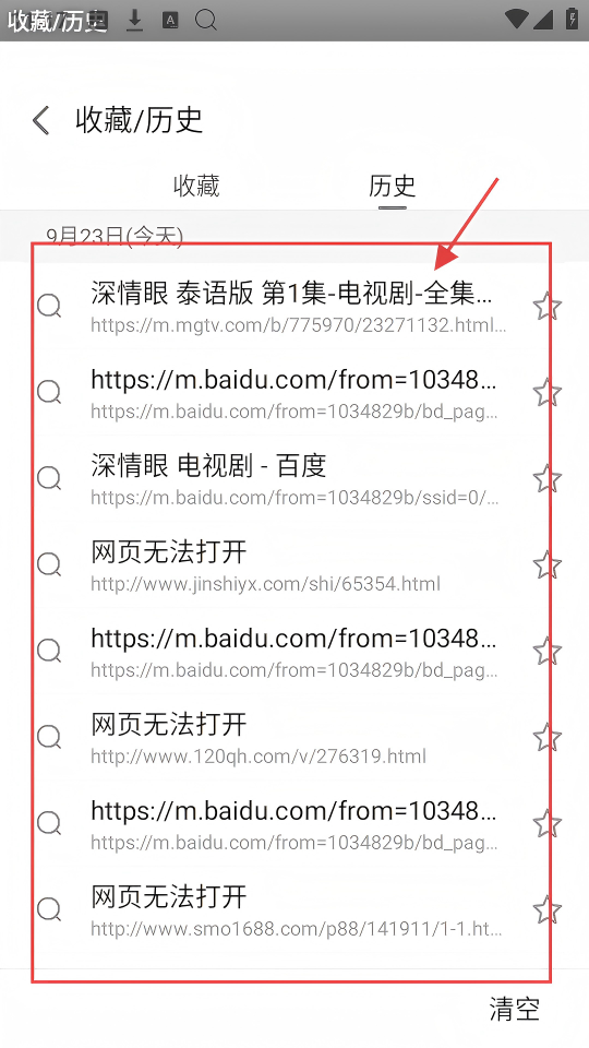 3、进入【收藏/历史】的历史页面,能看到多条历史记录,包括网页链接等,方便回顾之前浏览的内容啦。