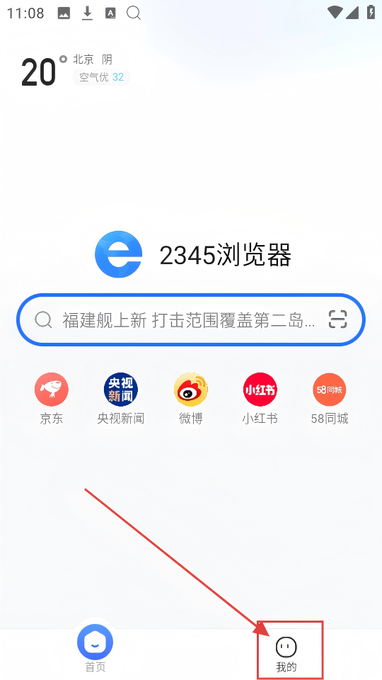 1、在2345浏览器首页,点击右下角【我的】,能进入个人相关页面,开启后续操作呢。