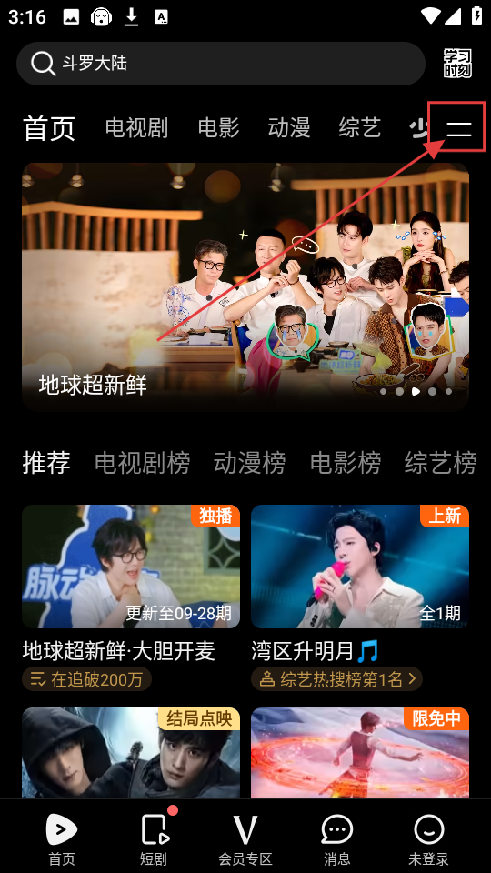 1、在软件首页,点击右上角两条横线的菜单图标,就能展开全部频道列表,选择想看的频道啦。