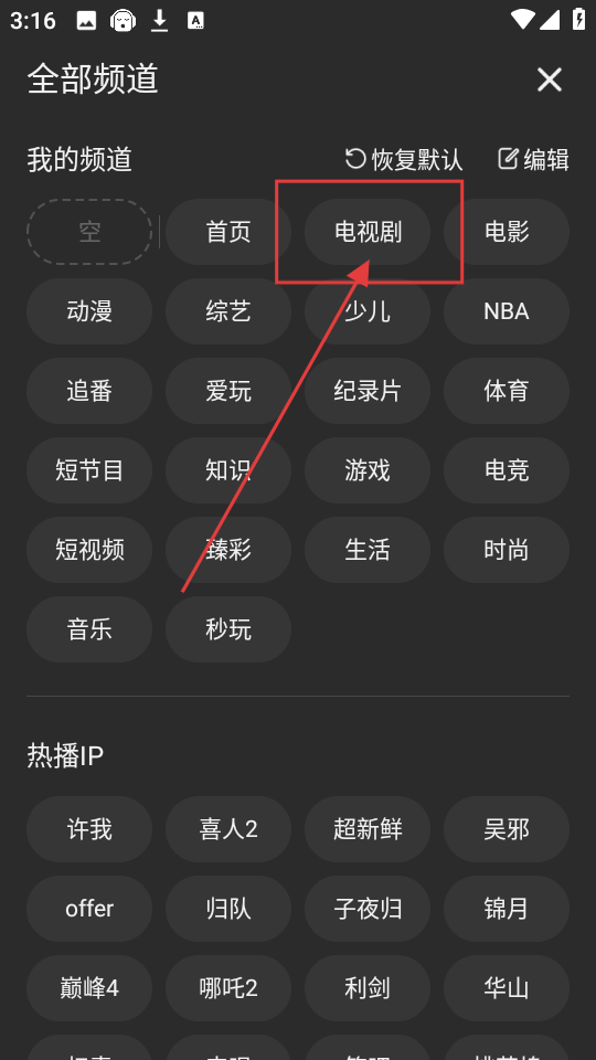2、在全部频道列表里,点击【电视剧】频道,就能进入电视剧专区页面,浏览各类电视剧内容咯。