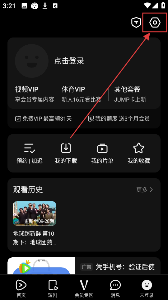 2、然后在个人中心的页面中我们不仅可以看到会员到期时间,还可以看到观看历史,在这里我们点击右上角的【设置图标】;