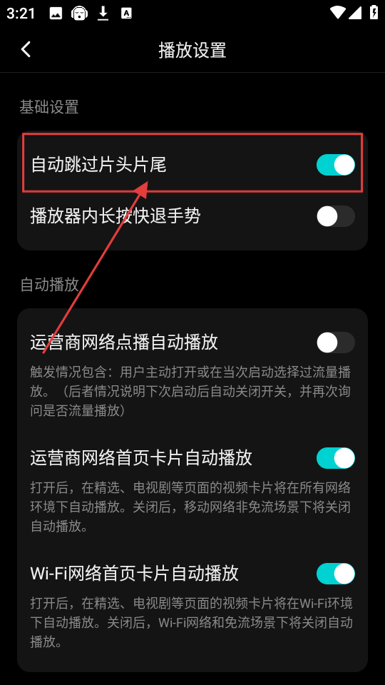 4、在播放设置页面,找到【自动跳过片头片尾】选项,开启对应的开关,就能让视频自动跳过片头片尾,提升观看体验。