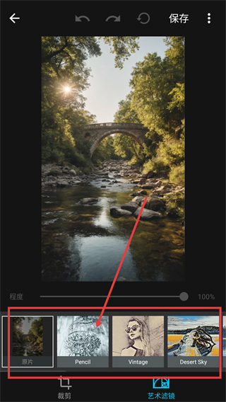 2、在滤镜页选择【Pencil】风格,应用后图片会变成素描质感,还能拖动滑块调整效果程度哦。