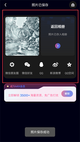 4、保存成功后会弹出分享界面,可选择【微信好友】等渠道分享图片,也能点击【返回相册】查看成品哦。