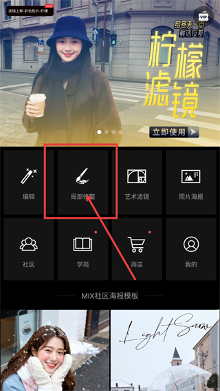 1、在MIX应用首页,点击【局部修整】选项,进入图片编辑的局部调整界面,可对素材做精细化处理啦。