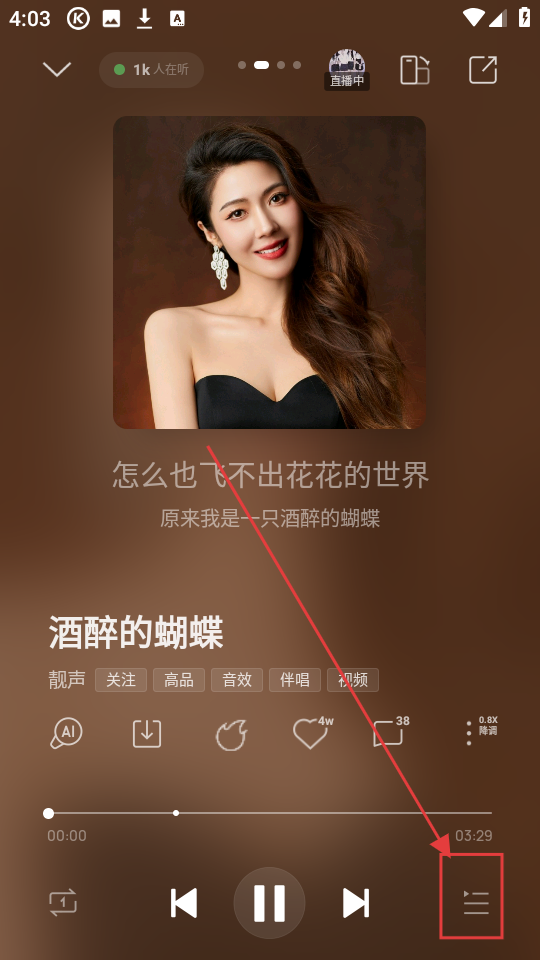 1、在APP播放时,点击播放界面右下角的队列按钮,查看正在播放的歌曲列表。
