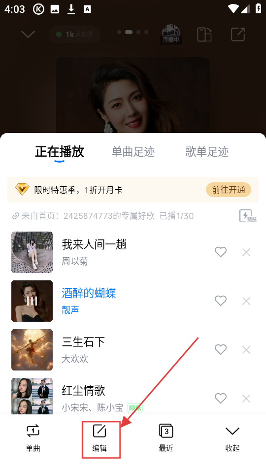 2、在弹出的播放队列页面,点击【编辑】按钮,进入队列编辑模式,以便调整歌曲顺序哦。