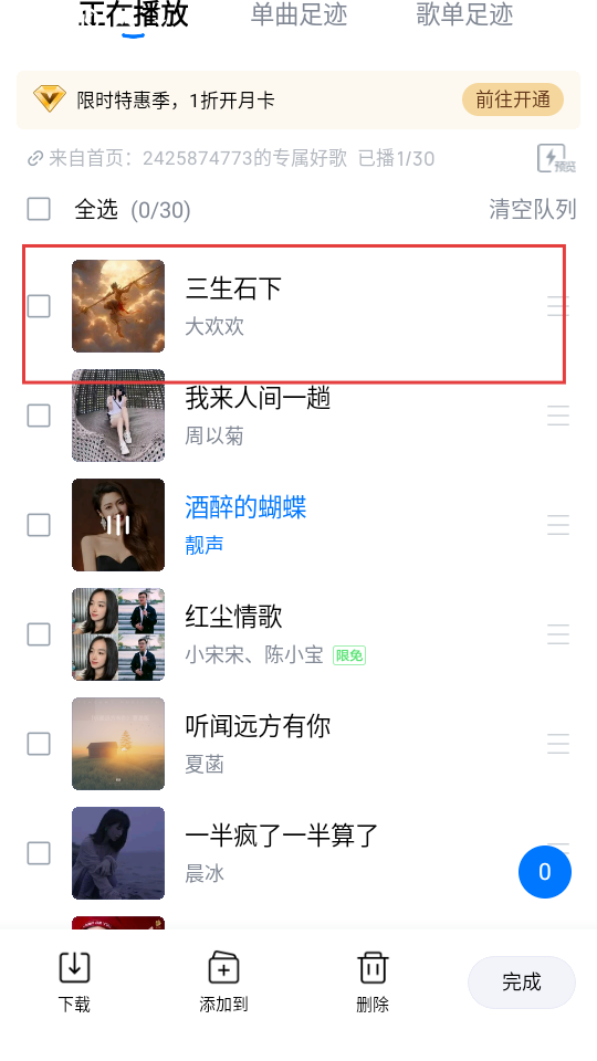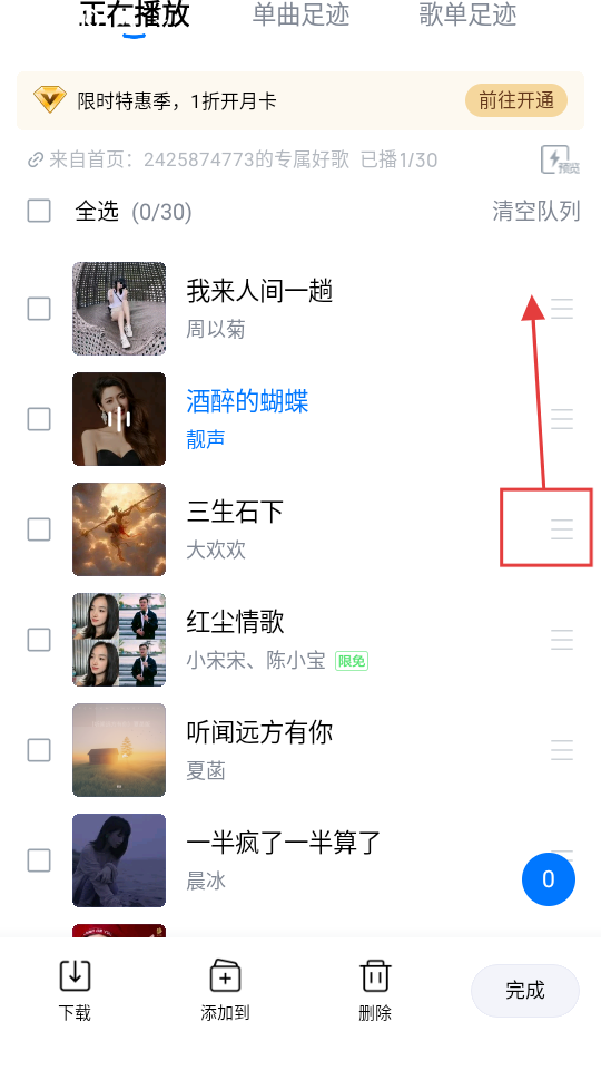 3、进入编辑模式后,找到要调整的歌曲,如《三生石下》,点击其右侧的拖动按钮,准备移动位置。