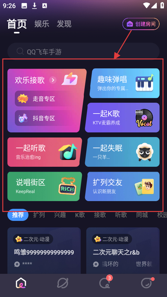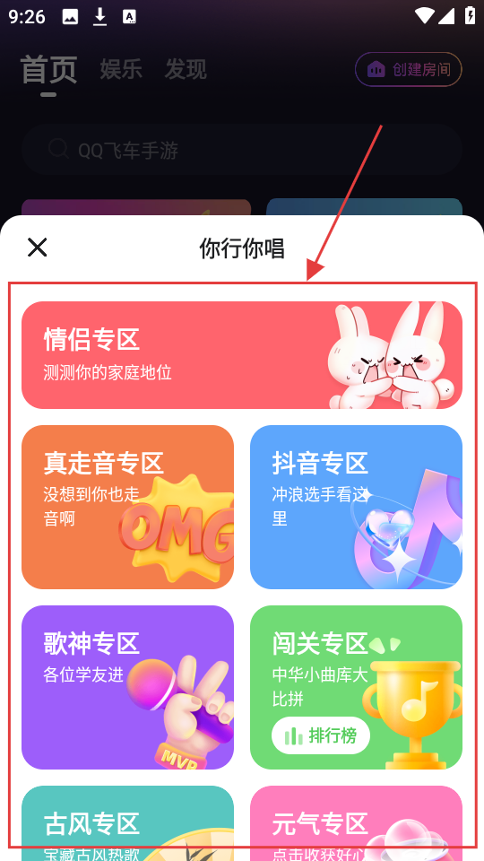 1、在首页选择喜欢的音乐功能板块,比如【欢乐接歌】,就能进入对应的音乐玩法页面哦。