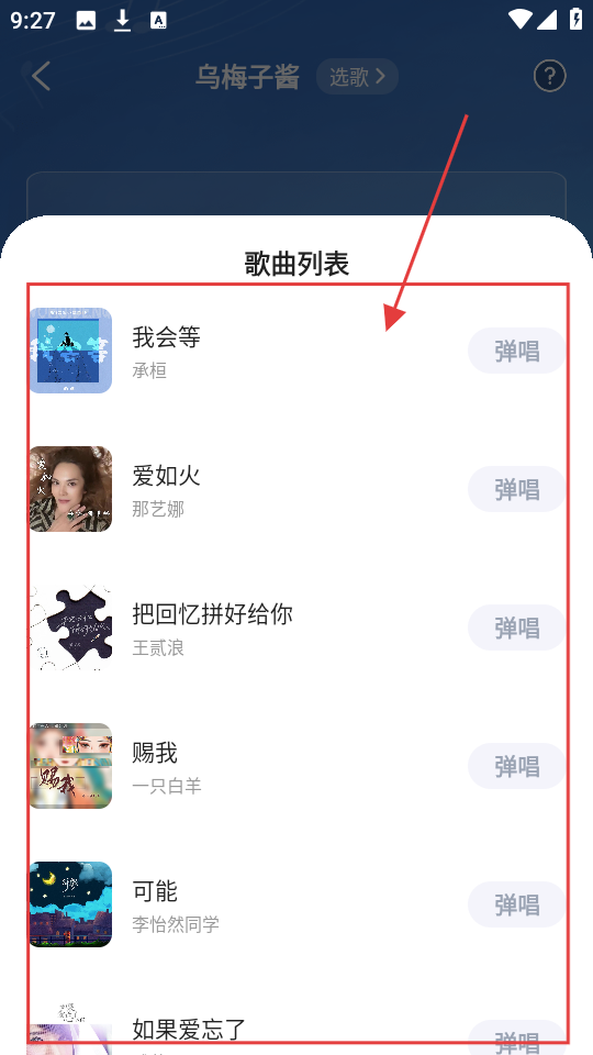 4、在歌曲列表里选择喜欢的歌曲,点击弹唱,就能开始你的音乐弹唱表演啦。