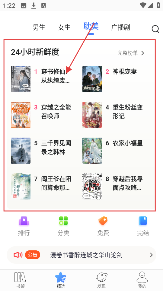 1、在软件精选页面耽美分类下,点击书籍,可进入作品详情页,了解书籍信息啦。