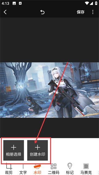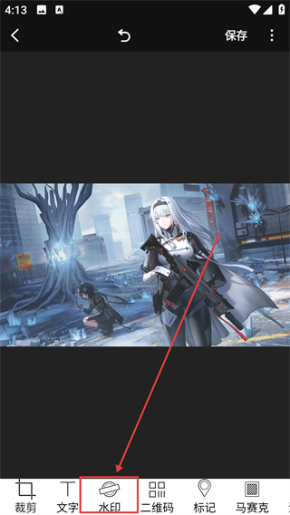 2、进入编辑页后,点底部【水印】选项,就能调出水印相关功能,准备给图片添加水印哦。