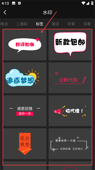 4、在水印模板页,选心仪的标签类水印,像【好评如潮】这类样式,就能添加到图片上啦。